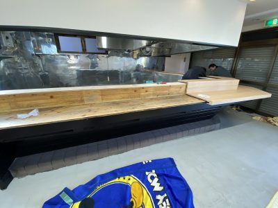 ラーメン屋さんの改装工事でしたので、もともとあった既存の天板の上から新しい天板を製作して、取り付けをいたしました。