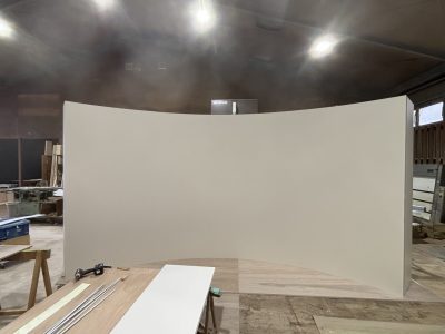 ポップアップスペース用のアールパネルを製作しました。ゆるやかに曲線を描く形状で、空間全体にやわらかさと存在感があります。仕上げはメラミンのため、気を使いながらの製作でした。